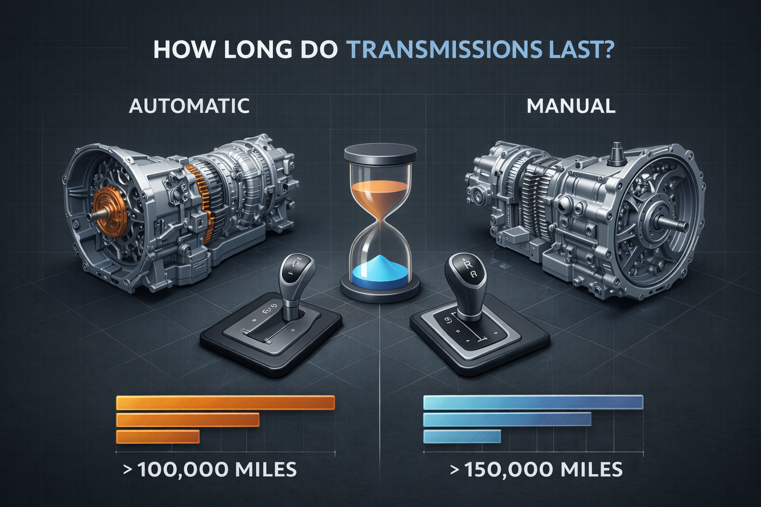 In this definitive guide, we’ll break down how long automatic and manual transmissions really last, why they fail, how driving habits affect them, and what you can do to make yours last as long as possible.